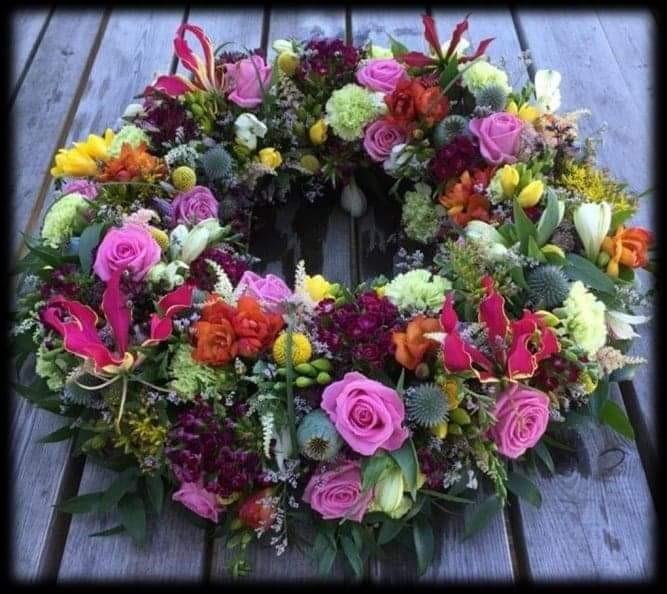 En smuk tætpyntet oasiskrans med sommerens nuancer.