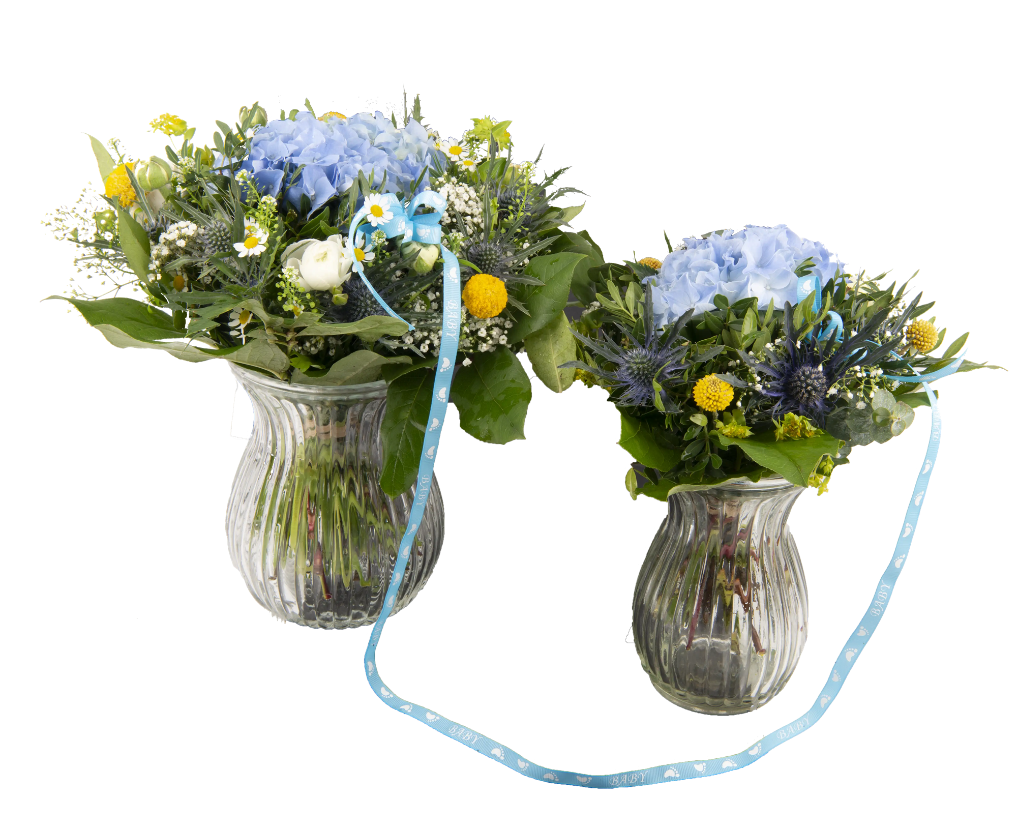 Ønsk de nybagte forældre tillykke med deres lille ny. Buketten består af en to-delt buket hvor et bånd binder buketterne sammen, som et symbol på navlesnoren. Buketten er med blomster i smukke hvide og blå farver.